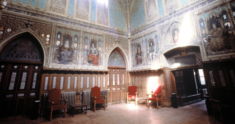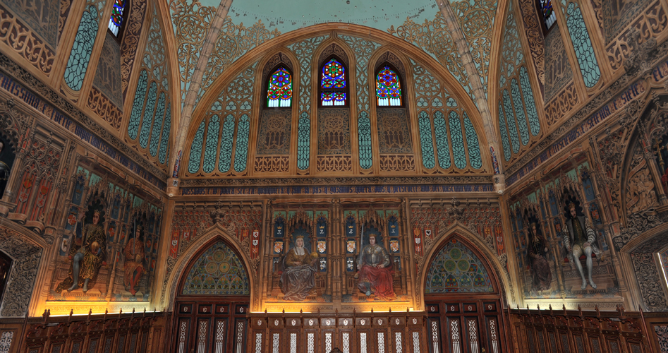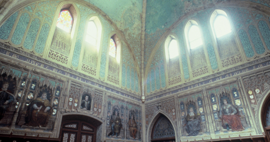 Más llamativas aún resultan las estancias interiores, decoradas con pinturas al fresco, techumbres de madera, decoraciones de yeso y cerámica vidriada. Muchos de estos elementos ornamentales procedían de antiguos edificios de Toledo, Jaén, Guadalajara o Alcalá, como la bóveda ojival del salón de los Reyes, procedente de la antigua fortaleza de Santorcaz. A lo largo de sus muros, en la parte baja, se dispone una interesante Galería de los Reyes, donde se representa a los monarcas de Castilla, desde Alfonso X hasta el Emperador Carlos V, siguiendo los modelos de las series icónicas codificadas en el Renacimiento por Felipe II. Sobre la gran bóveda, por encima de los ventanales con vitrales, se reproduce una visión propia de la cosmología medieval, compuesta por la representación de los días y meses del año figurados en el borde de la esfera celeste, en la que se reproducen las constelaciones.