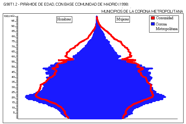 Padrón Continuo 1998. Pirámides de edades por zonas metropolitanas, con base total Comunidad